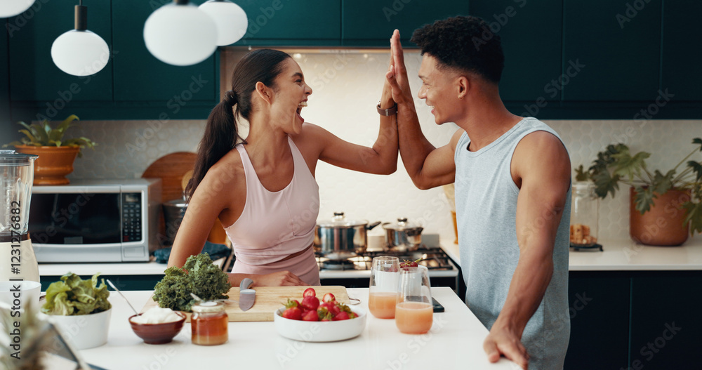 Kitchen, cooking and happy couple high five for success, fitness goal or food for nutrition. Woman, man and celebration in home together for achievement, healthy diet or excited for wellness target