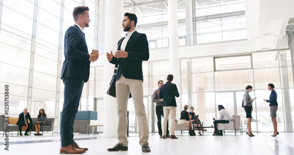 Business, men and networking event in office for b2b collaboration, financial expo and startup ideas. Seminar review, people and low angle at global convention for career development and workshop
