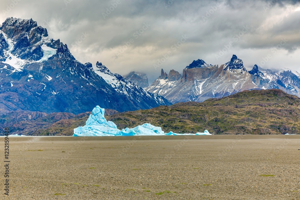 View from the far end of Lago Grey with icebergs and dramatic mountain backdrop in Torres del Paine