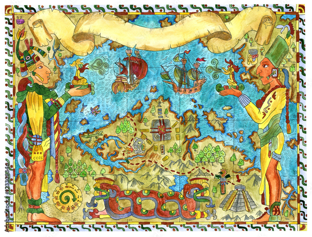 Hand drawn illustration with pirate map of maya and aztecs treasures