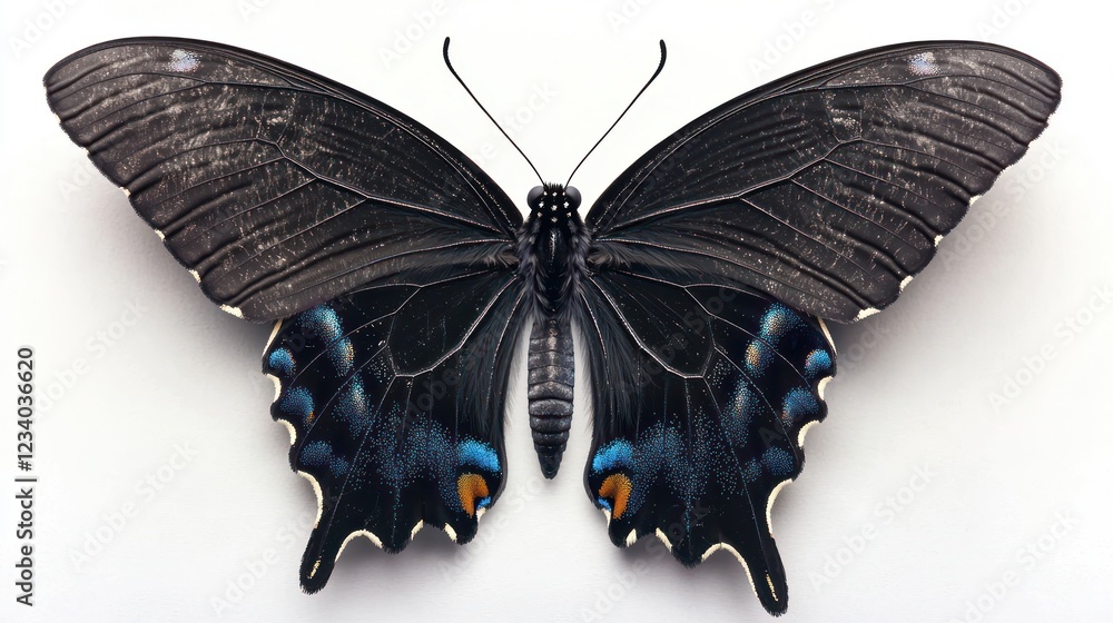 A striking black butterfly with iridescent blue accents and unique wing patterns, showcasing the beauty of nature's design.