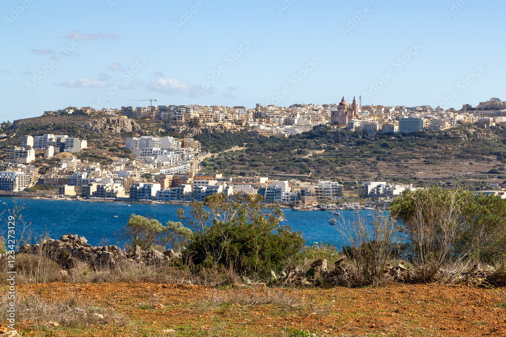 a beautiful cityscape view of Mellieha with the coastline of Mellieha Bay in Malta