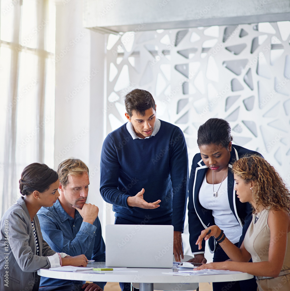 Business people, proposal or laptop in meeting for presentation, teamwork or budget review. Planning, research or manager with online information for startup project capital or social development
