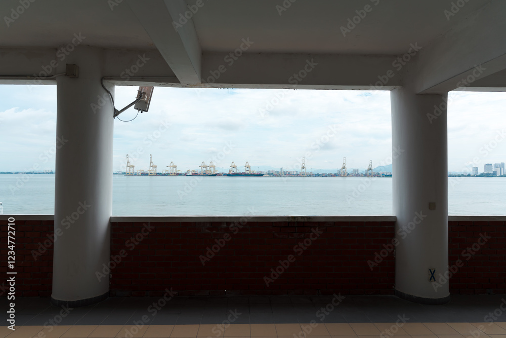 Beautiful view of the blue sea with 2 pillars and wall as frame at Penang Island, Malaysia. Perfect for background or travel wallpaper