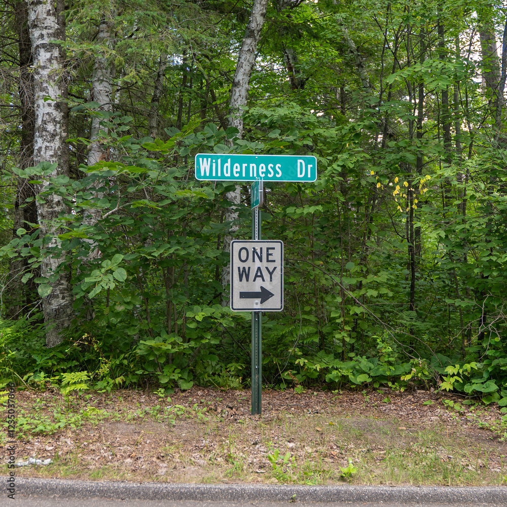 Metal signs on the boulevard of a tree lined street at an intersection.