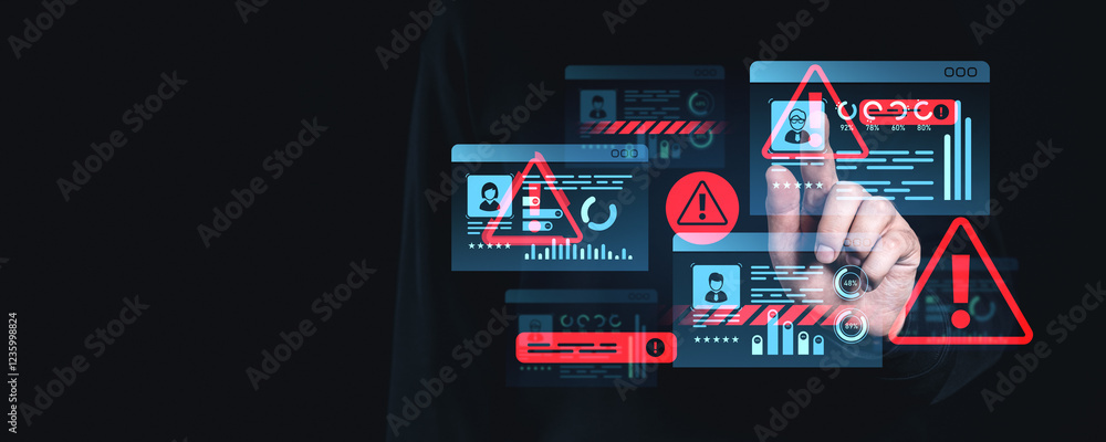 Cybersecurity warning interface with red alert symbols on digital identity screens.