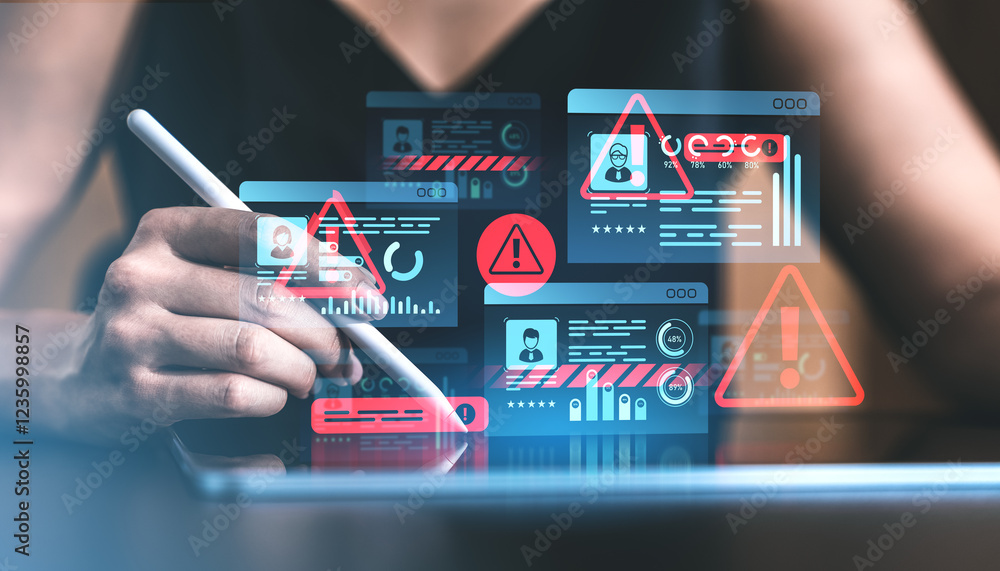 Cybersecurity warning displayed on digital interface with hand interacting on tablet.
