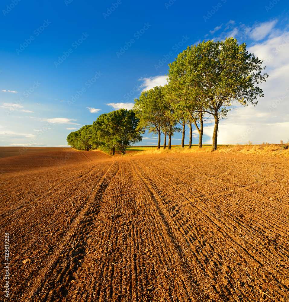 Row of Poplar Trees besides Plowed Field in the Warm Light of the Setting Sun