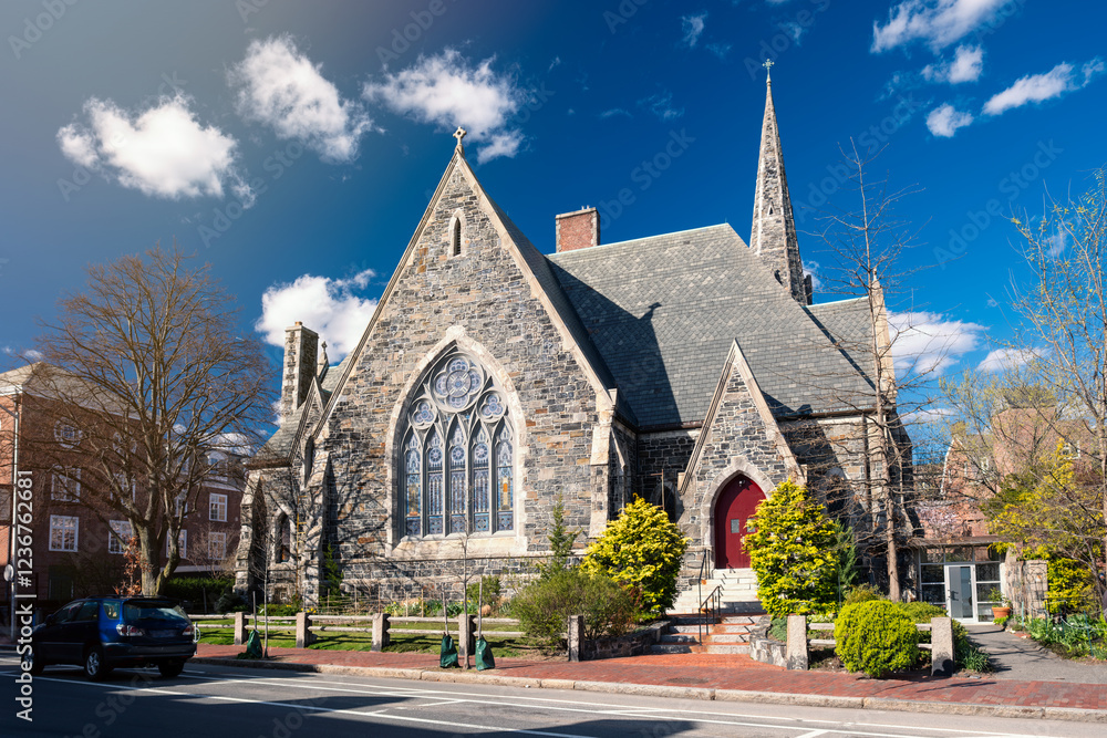 Generated Stone Church with Red Door Surrounded by Nature and Parked Vehicles