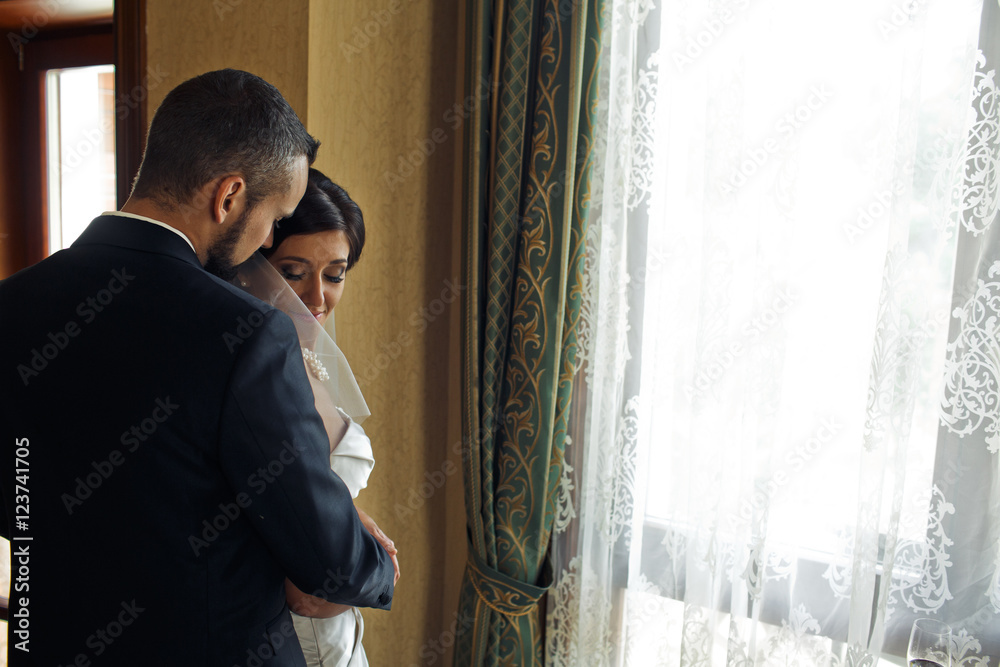 The lovely couple in love stand near window