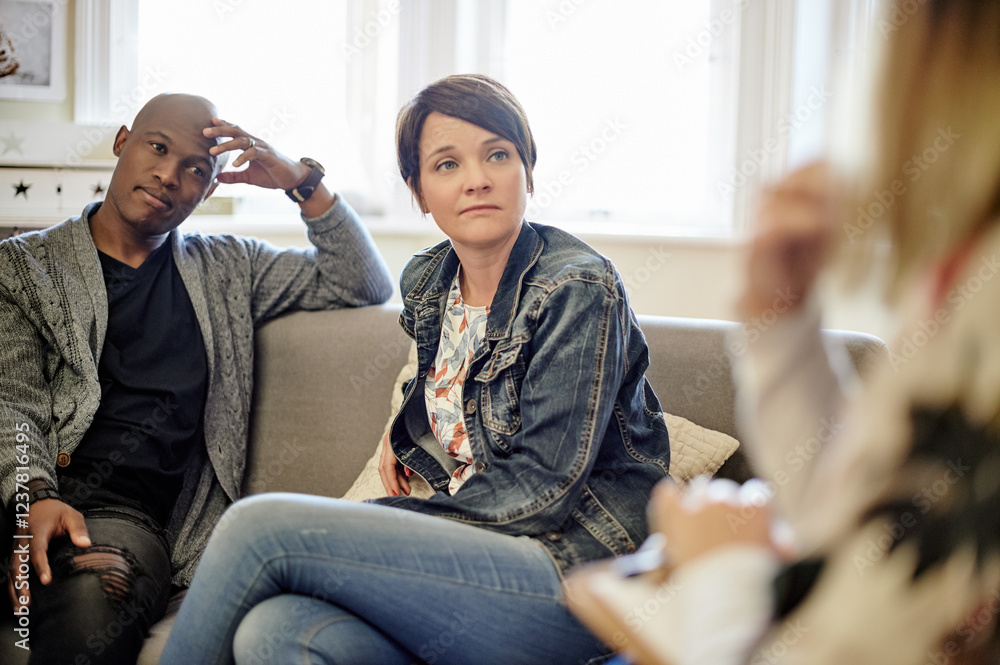 Interracial couple, counseling fight and therapist sofa with psychology conversation and support. Psychologist, consultation and lounge couch with people having marriage, divorce and therapy problem