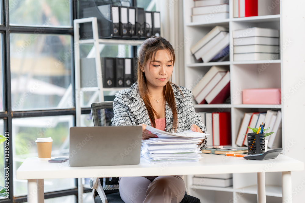 Focused Businesswoman at Desk: A determined businesswoman meticulously reviews paperwork at her organized desk, showcasing dedication and professionalism in a modern office setting.