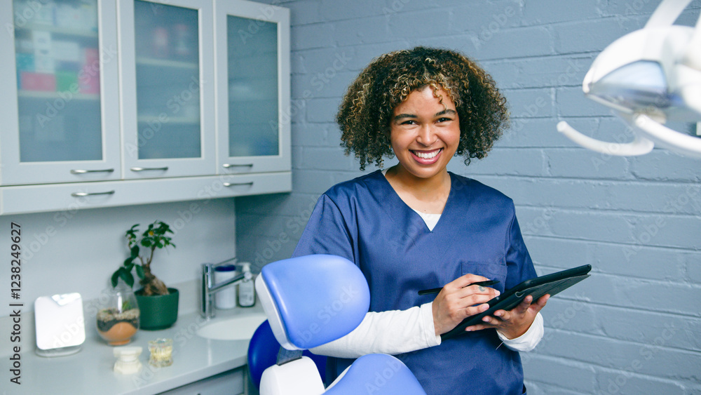 Smiling Dental Professional Holding Tablet in Modern Clinic