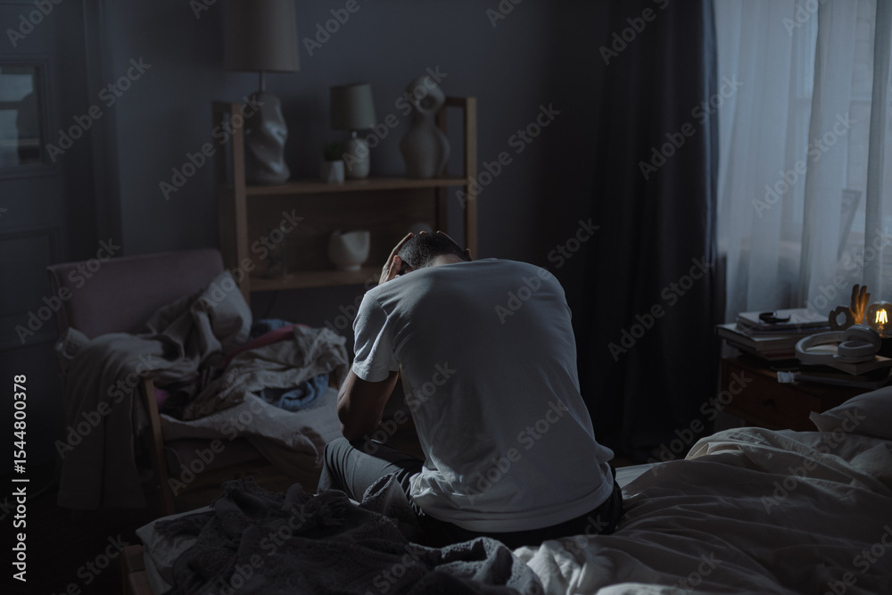 Top view young calm Indian man he wear orange casual clothes lay down on blue sofa couch sleep take nap stay at home hotel flat rest relax spend free spare time in living room indoor. Lounge concept.