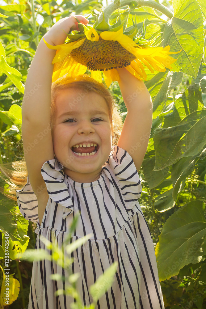 Little beautiful smiling girl holding sunflower flower in sunflower field in summer