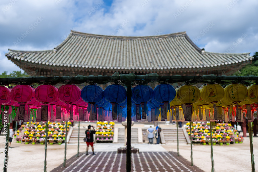 Vibrant lanterns illuminate the serene beauty of a traditional Korean temple, creating a festive atmosphere.