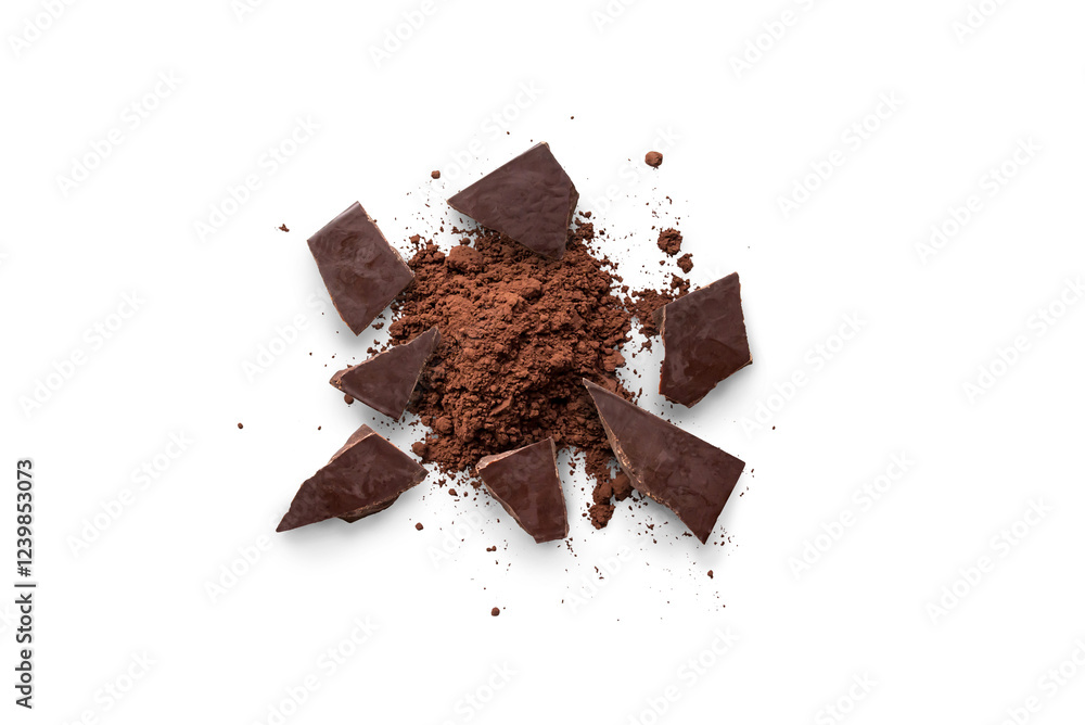 Folgende Fotos können Ihr Interesse wecken: schokolade, bar, broken, pulver, oberteile, isoliert, kakao
