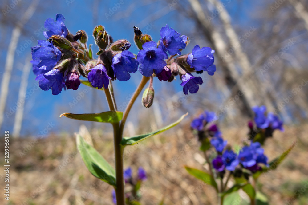 Baikal wildflower is blue. Pulmonaria Munstead Blue. Blooming wild flowers close-up. pulmonaria officinalis known as lungwort, common lungwort.