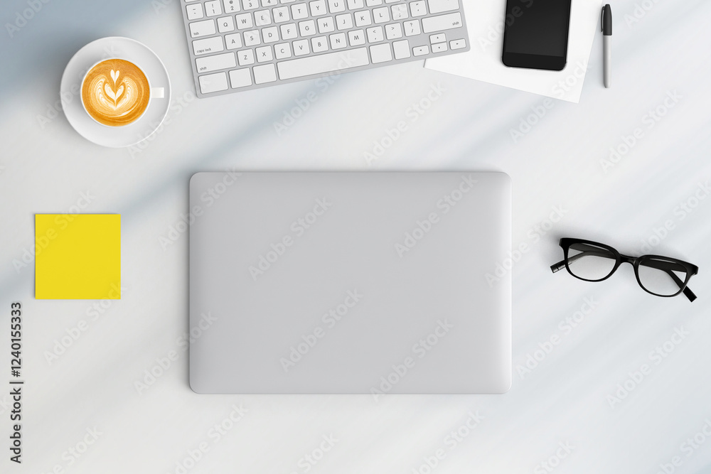 Modern workspace with copy space on table background. Top view with copy space. Flat lay style. Minimal blank mockup.