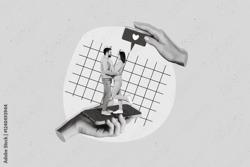 Photo of love couple hugs together embracing trust support idyllic stay smartphone display like notification online isolated on plaid background