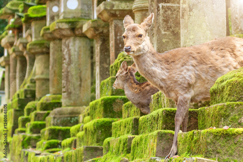 Young deer in Nara Park, Japan. The deer, the symbol of the city of Nara, roam freely and are considered in Shinto to be the messengers of the Gods.