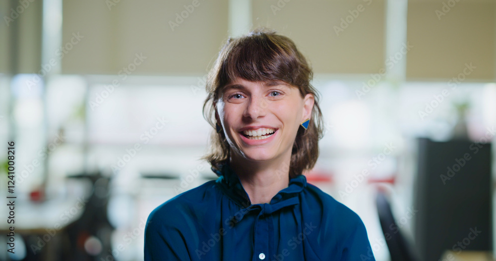 Happy gen z woman lady intern sitting look cam do work casual talk client on video call day office. Head shot young adult worker expert female girl speak casual share idea plan teach study job place