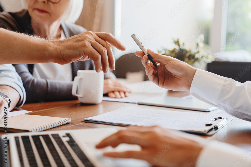 Close up of 60s husband and wife sit at desk sign health insurance contract close deal, smiling old mature couple spouses put signature on document make good agreement, elderly healthcare concept