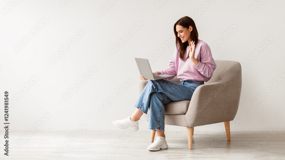 Online communication. Smiling Caucasian woman making video call with friends or family, using laptop, waving at webcam, sitting in cozy armchair against white studio wall, banner with copy space