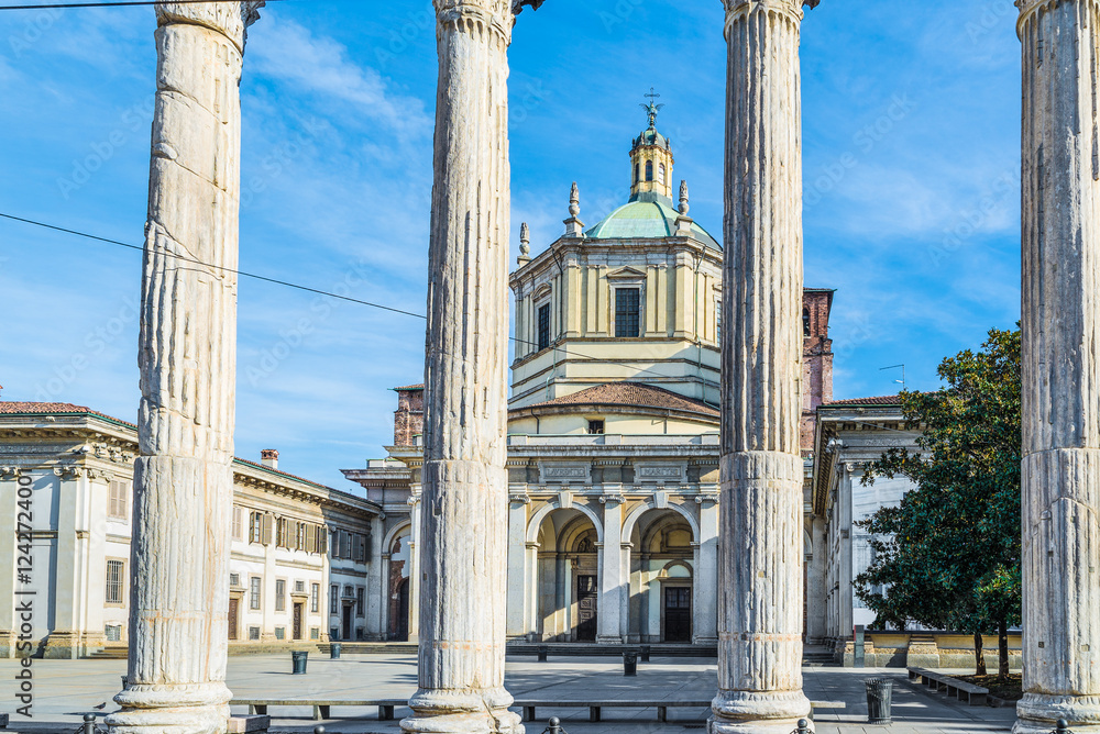 Milan city, Italy. Basilica of San Lorenzo Maggiore (4th century origins with later modifications) and the Colonne di San Lorenzo (Columns of San Lorenzo), ancient Roman ruins in central Milan
