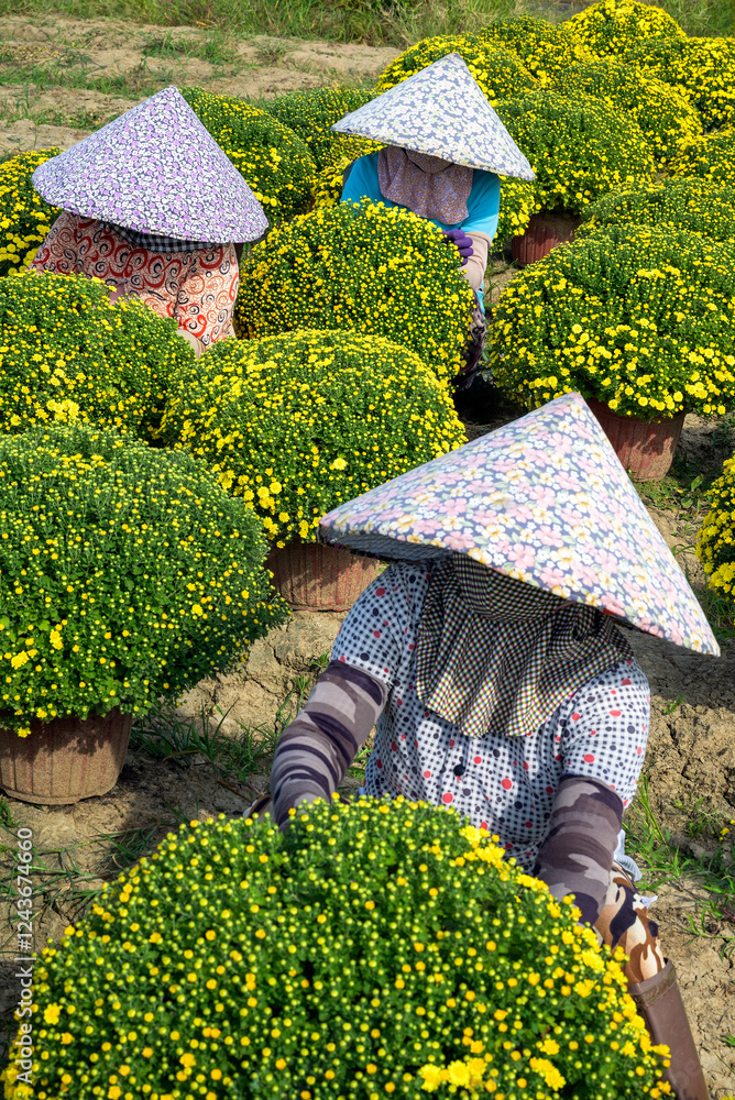 Women harvest bunches of blooming chrysanthemums in Go Cong Tay district of Tien Giang province, Vietnam. The flowers are sold for Vietnam's Lunar New Year.