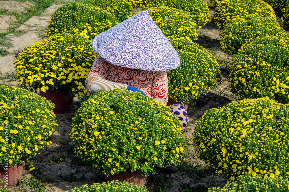 A woman harvest bunches of blooming chrysanthemums in Go Cong Tay district of Tien Giang province, Vietnam. The flowers are sold for Vietnam's Lunar New Year.
