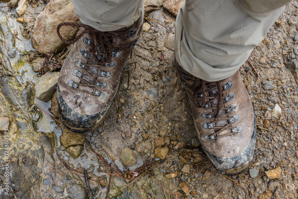 Wanderschuhe eines Pilgers auf schlammigem Weg