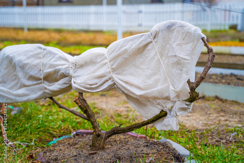 Grapes are wrapped in agrofibre in winter to protect them from freezing. Protecting vineyards during winter