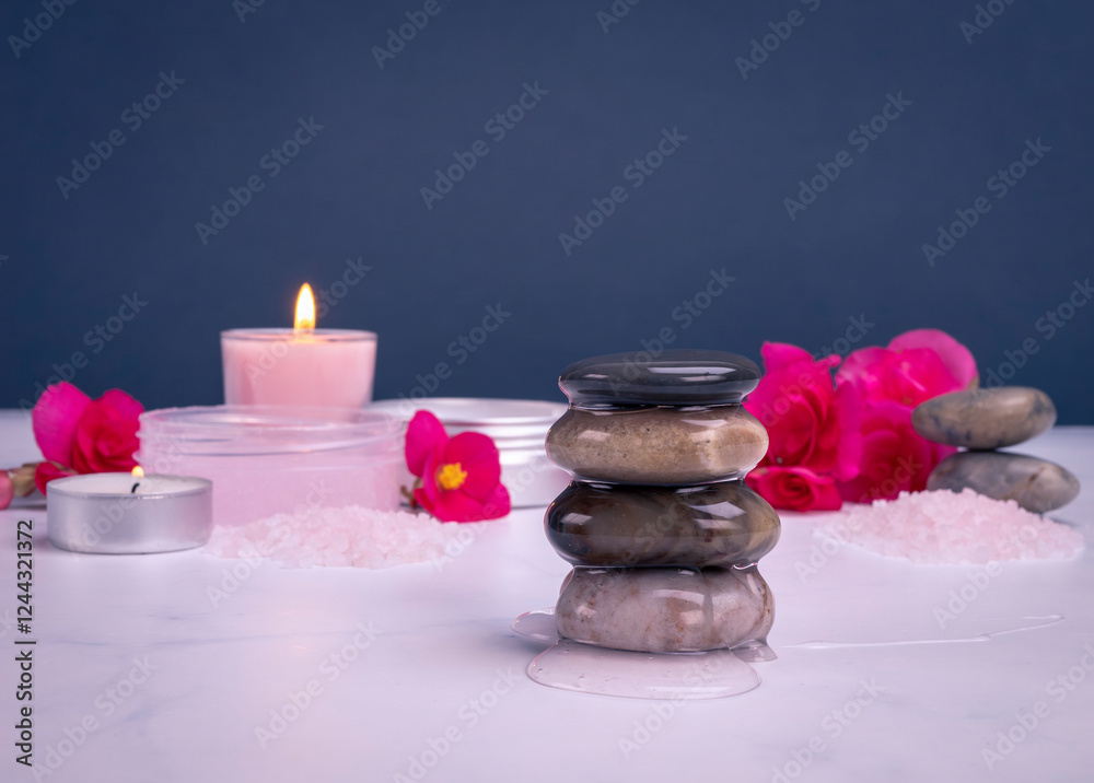 Shower gel flowing on spa stones with body care products, flowers and candles. Natural body wash product, spa, relaxation, skin care, freshness, wellness, organic concept.