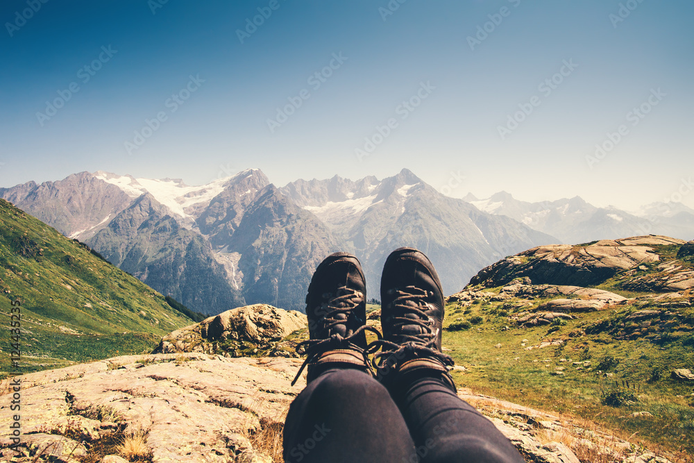 Feet trekking boots hiker selfie relaxing with mountains landscape view outdoor Travel Lifestyle concept active Summer vacations adventure