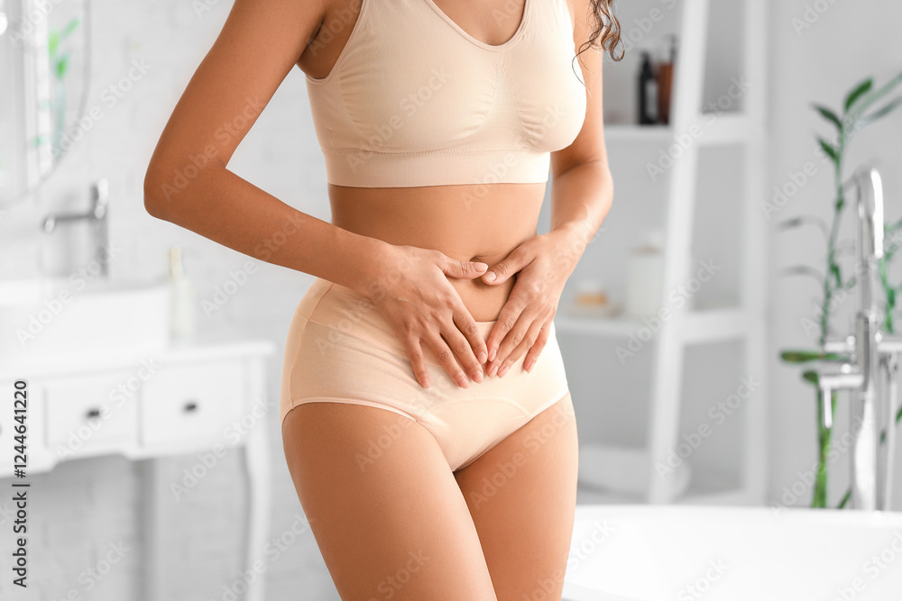 Young woman wearing beige menstrual panties in bathroom, closeup