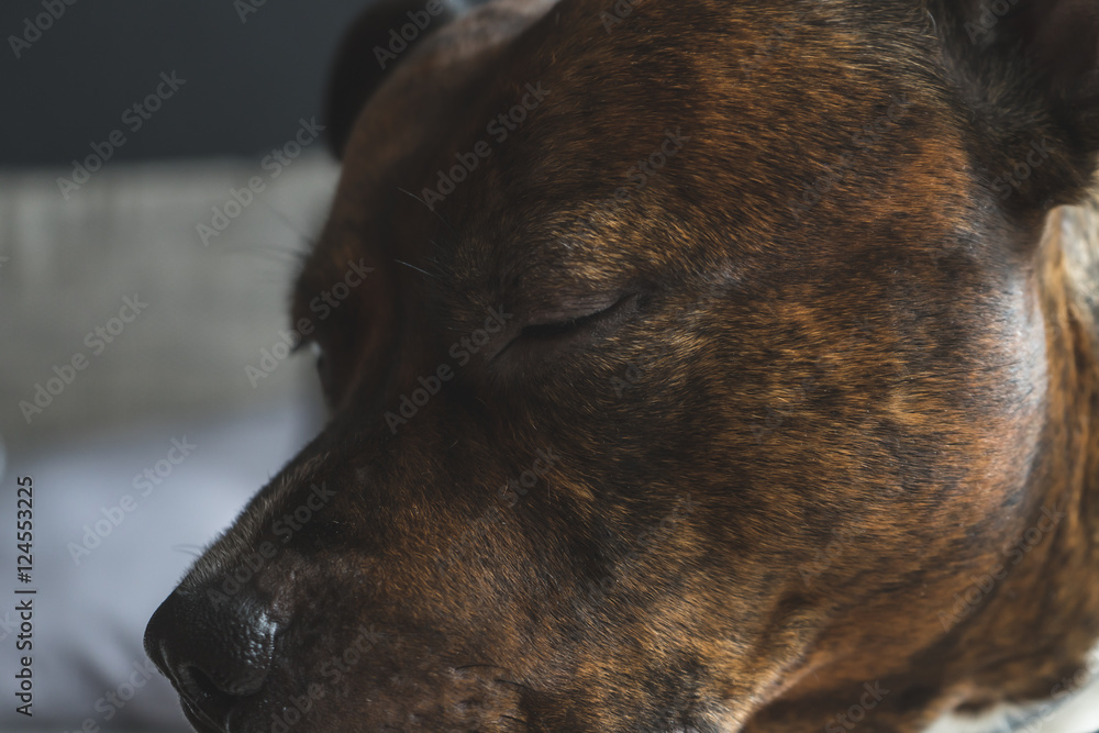 Detail on staffordshire bull terrier head with closed eyes. Sad stafford close up. Low contrast photo of sleeping dog. - soft focus