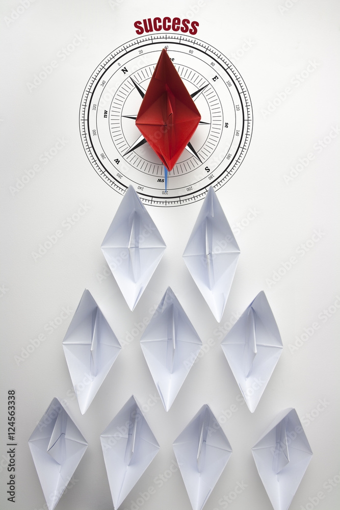 Leadership and success with a business team as red paper boat on compass in the shape of an arrow and the leader as a red manager at the top directing the people to succeed in the business world.