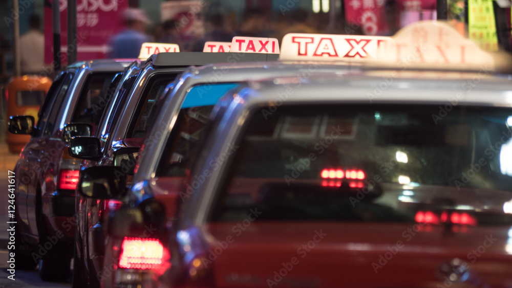 Queue of taxi cars in night street. Cabs with illuminated signs on the roofs parked in a row waiting for clients