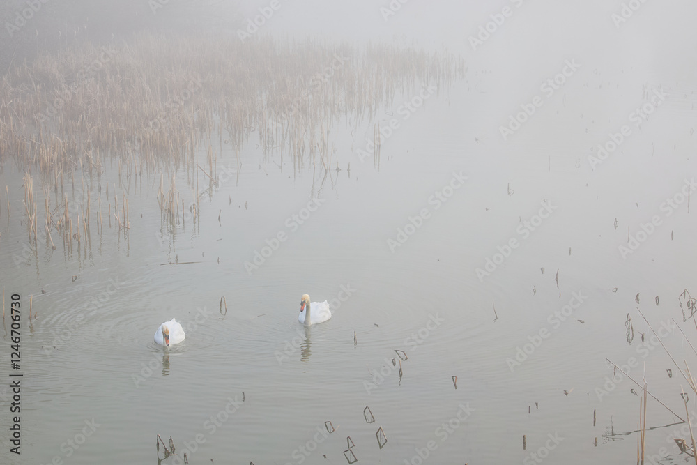 Two mute swans (Cygnus olor) on a misty lake in a weak morning sunlight with reeds behind: a light pastel shaded image with copy space.
