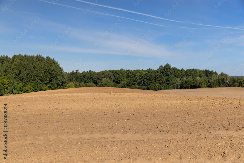 trees growing in the forest in spring next to the field on which the soil was plowed for sowing grain