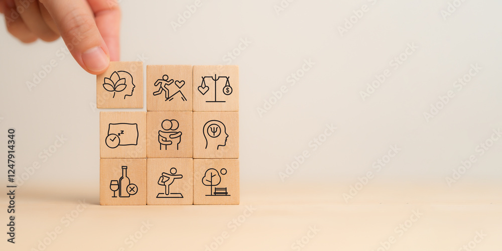 Holistic Wellness Concept. Wooden block with wellness icons, health care ,including mental well-being, fitness, nutrition, sleep, relationships and financial balance. Personal development and balance.