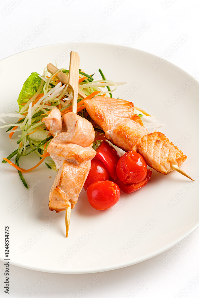 Savory Salmon Skewers Served With Fresh Vegetables and Cherry Tomatoes, a Delightful Culinary Experience Showcasing Vibrant Flavors and Colors