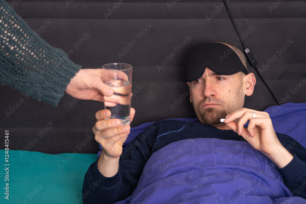 Grumpy Man in Bed with a Headache and Hangover Takes Water and Painkiller from His Wife