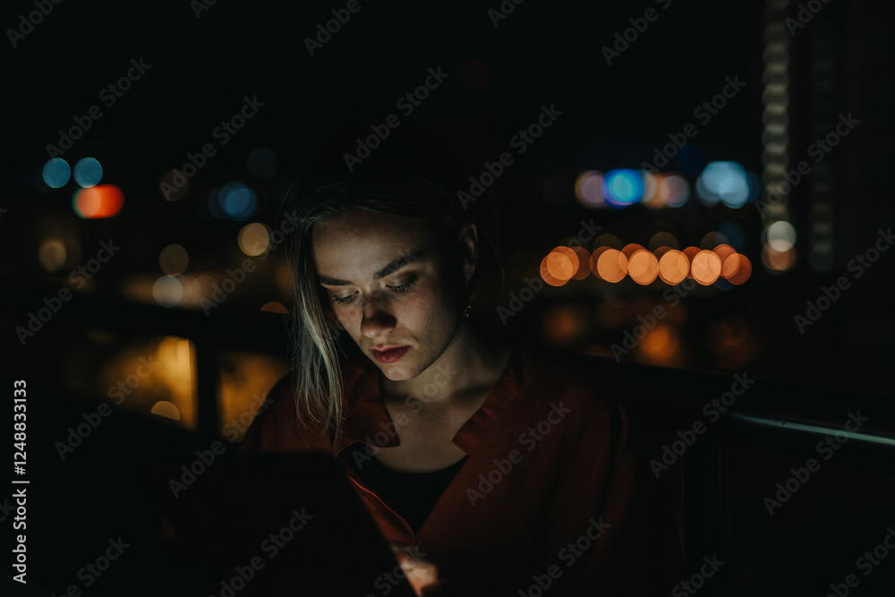 A woman intensely focused on her tablet while working at night, surrounded by blurred city lights, showcasing concentration and dedication in a modern urban setting.