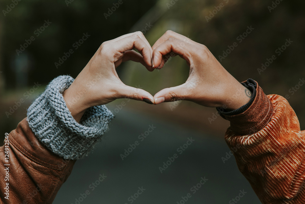 hands linked with heart sign outdoors