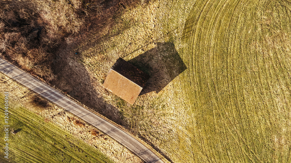 Springtime Aerial View of Rural Cottage and Shed in a Field