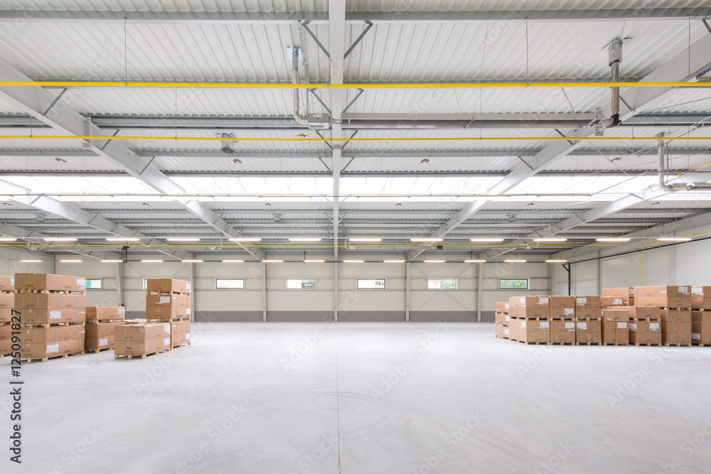 Hala stalowa symetryczna z ustawionym towarem na paletach w kartonowych opakowaniach