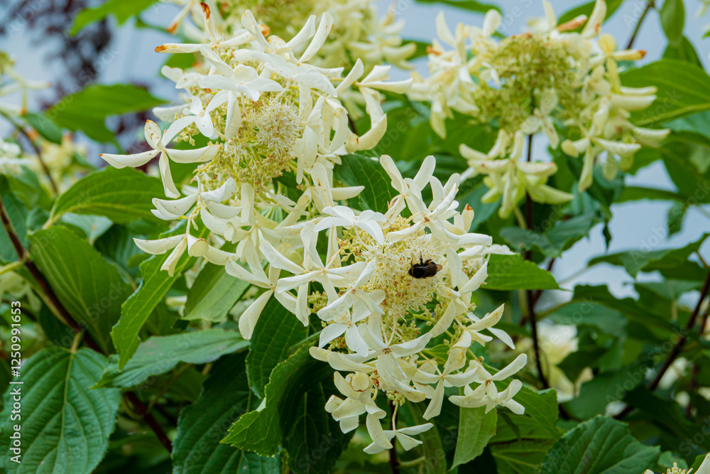 Beautiful White Flowers Bloom With Delicate Petals as a Bee Collects Pollen in a Tranquil Garden Setting During Late Spring