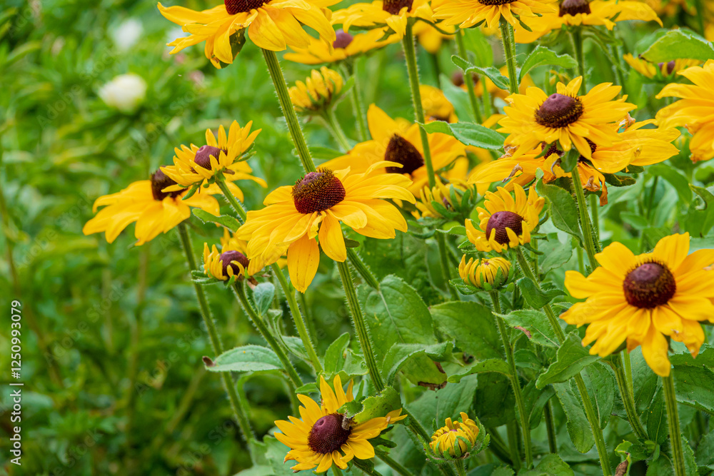 Colorful Yellow Flowers Bloom Vibrantly in a Lush Garden Setting During the Warm Days of Summer, Creating a Cheerful Atmosphere That Invites Exploration and Appreciation of Nature's Beauty